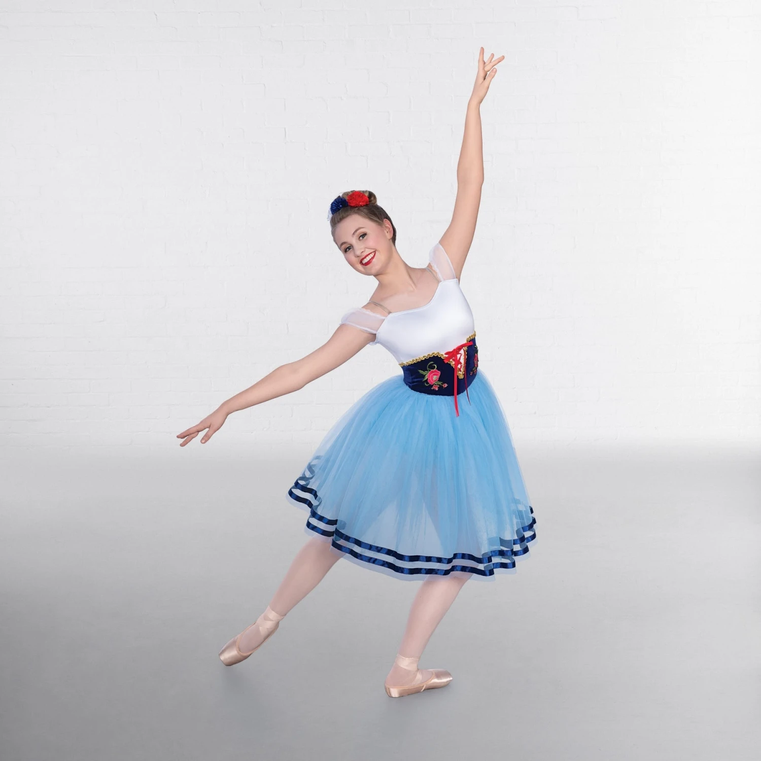 * Layers of light blue net make up the romantic tutu skirt with contrasting dark blue ribbon along the hem
