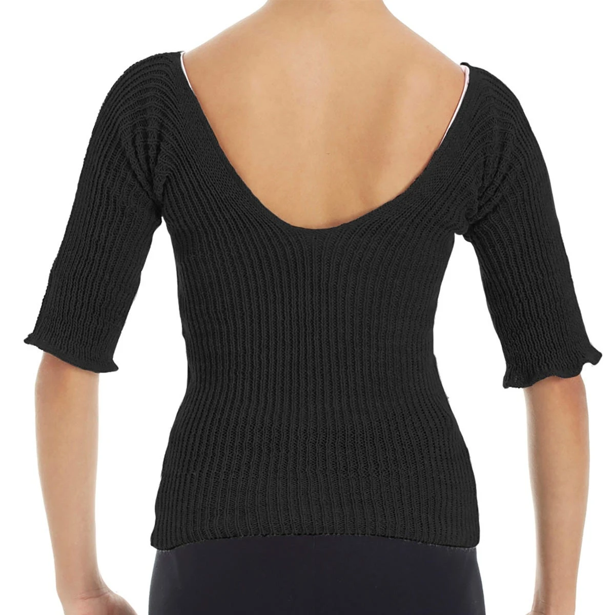 Intermezzo’s quality knitted v-neck snug crop top. This warm up sweater features 3/4 length sleeves, perfect for your warm up routine or to wear casually when it’s cold outside!