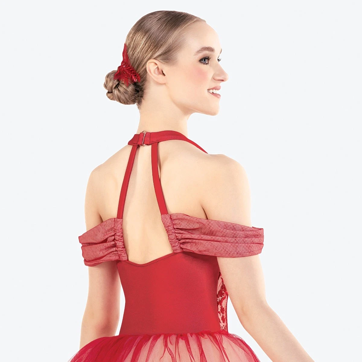 - Attached tulle sleeves with an elastic loop for securing