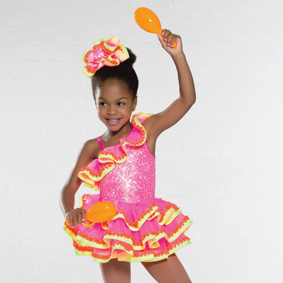 Sequin spandex leotard is fully-lined and features an asymmetrical organdy and ribbon ruffle and attached, adjustable satin shoulder strap. Attached skirt is layers of organdy edged with ribbon. Includes headpiece, bobby pins, maracas, hanger and garment bag.