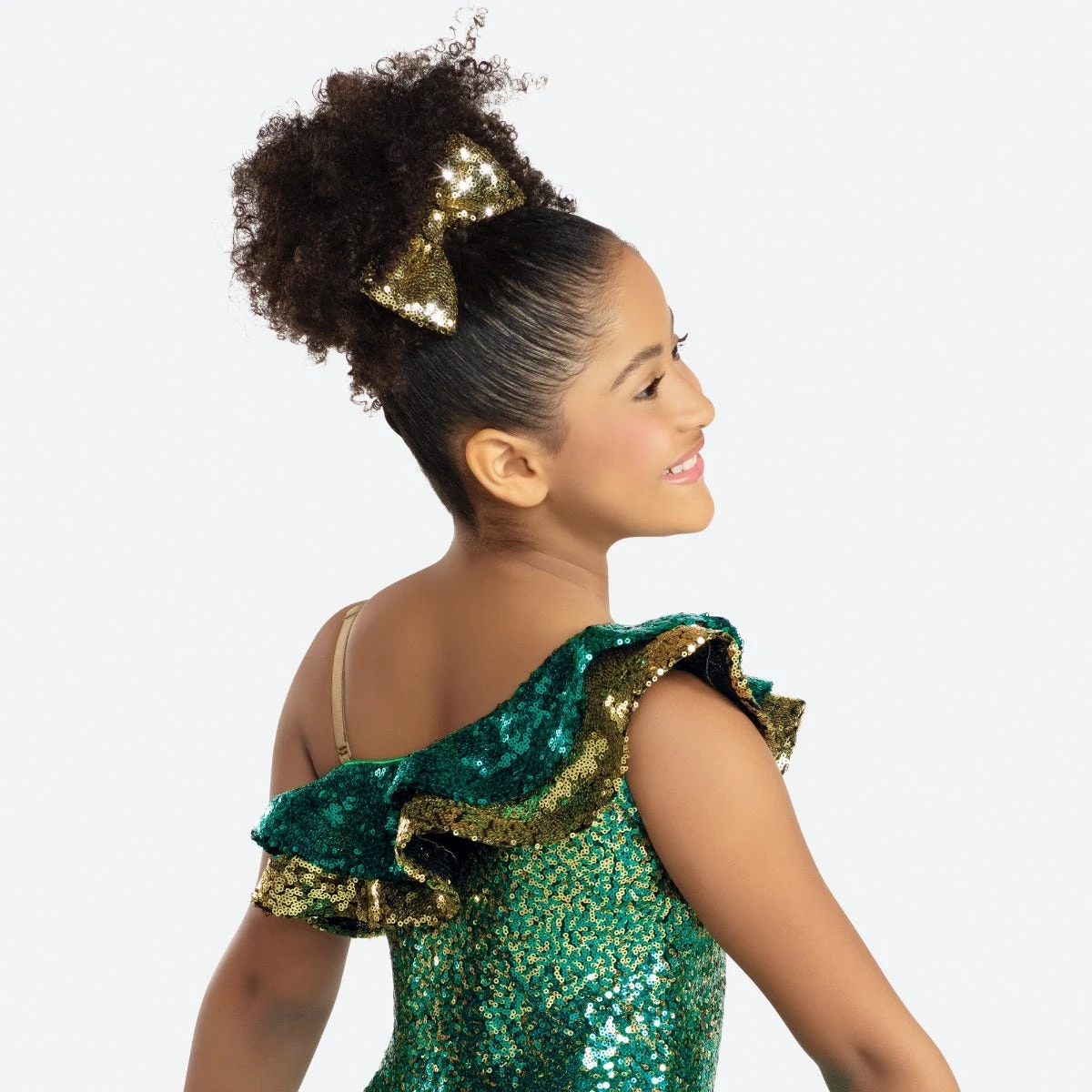 - Sequin mesh ruffles edged in horsehair at the neckline