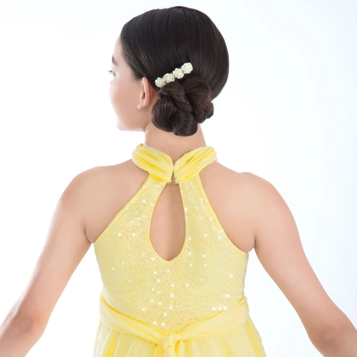 Spandex halter leotard with nude adjustable straps has extended bike-shorts leg line and chiffon collar that loops through front keyhole and clasps at neck to create back keyhole design. Front bodice has embroidered iridescent sequin spandex. Asymmetrical chiffon skirt is finished with chiffon belt at waistline. Includes hair comb, hanger and garment bag.