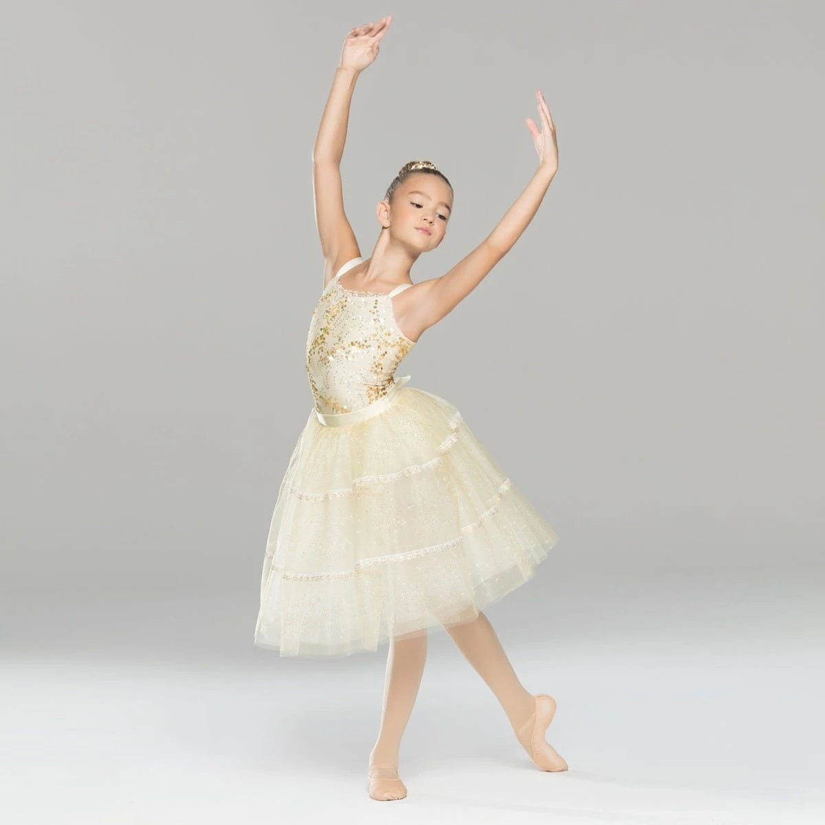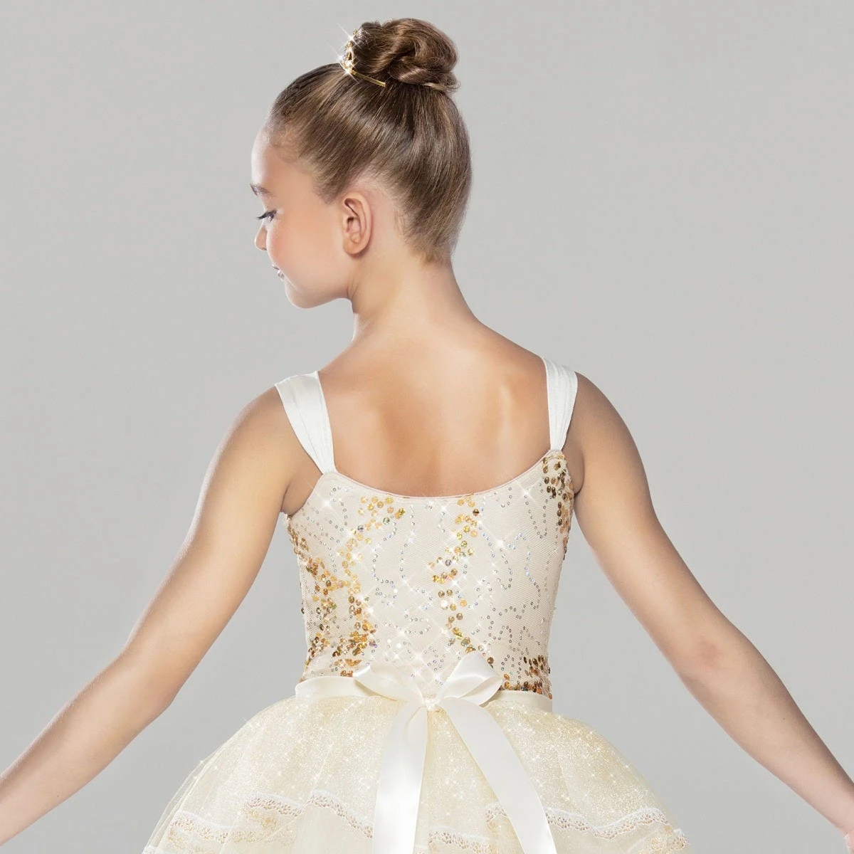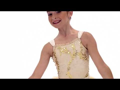* Spandex leotard has a bodice overlay of gold sequin mesh and lace neckline