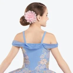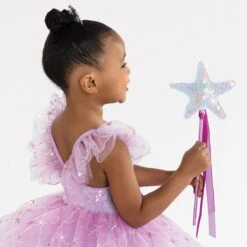 Fully lined sequin spandex leotard with organdy shoulder details has an attached spandex waistband and matching binding. Attached skirt is layers of organdy under a layer of organza. Includes hair bow, bobby pins, faux lollipop, hanger and garment bag
