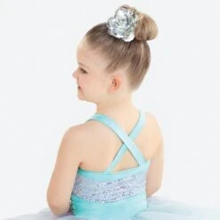 - Attached organdie skirt edged in sequin mesh and sequin trim
